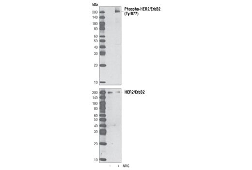 Phospho-HER2/ErbB2 (Tyr877) Antibody detects endogenous levels of ErbB2 only when phosphorylated at tyrosine 877. This antibody may cross-react with other ErbB family members (e.g., EGF receptor) when phosphorylated at their tyrosine residues.