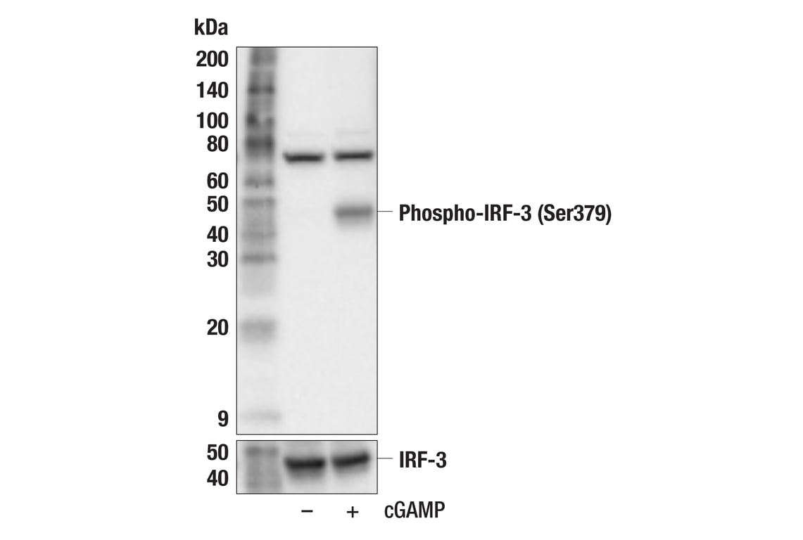 Phospho-IRF-3 (Ser379) (E8S3G) Rabbit Monoclonal Antibody (BSA and Azide Free) recognizes endogenous levels of IRF-3 protein only when phosphorylated at Ser379 in mice (equivalent to Ser386 of human IRF-3). This antibody cross-reacts wtih a 75 kDa protein of unknown origin.