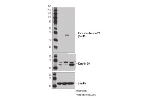 Phospho-Keratin 20 (Ser13) (D9M6O) Rabbit Monoclonal Antibody recognizes endogenous levels of keratin 20 protein only when phosphorylated at Ser13.