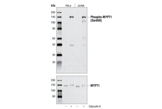 Phospho-MYPT1 (Ser668) Antibody is directed at a site that was identified at Cell Signaling Technology (CST) using PhosphoScan®, CST's LC-MS/MS platform for modification site discovery. Phosphorylation at Ser668 was discovered using an Akt substrate antibody. Please visit PhosphoSitePlus®, CST's modification site knowledgebase, at www.phosphosite.org for more information.