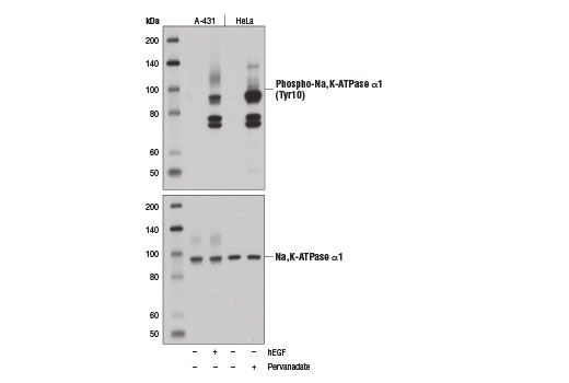 Phospho-Na,K-ATPase alpha1 (Tyr10) (E1Y9C) Rabbit Monoclonal Antibody recognizes endogenous levels of Na,K-ATPase α1 protein only when phosphorylated at Tyr10. This antibody cross-reacts with an induced 75-80 kDa doublet of unknown origin.