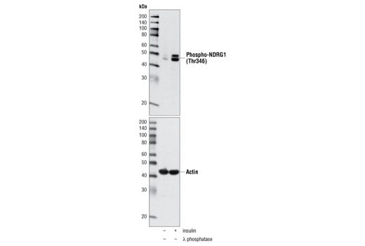Phospho-NDRG1 (Thr346) Antibody is directed at a site that was identified at Cell Signaling Technology (CST) using PhosphoScan®, CST's LC-MS/MS platform for modification site discovery. Phosphorylation at Thr346 was discovered using an Akt substrate antibody and was shown to be induced by insulin treatment in multiple cell lines. Please visit PhosphoSitePlus®, CST's modification site knowledgebase, at www.phosphosite.org for more information.