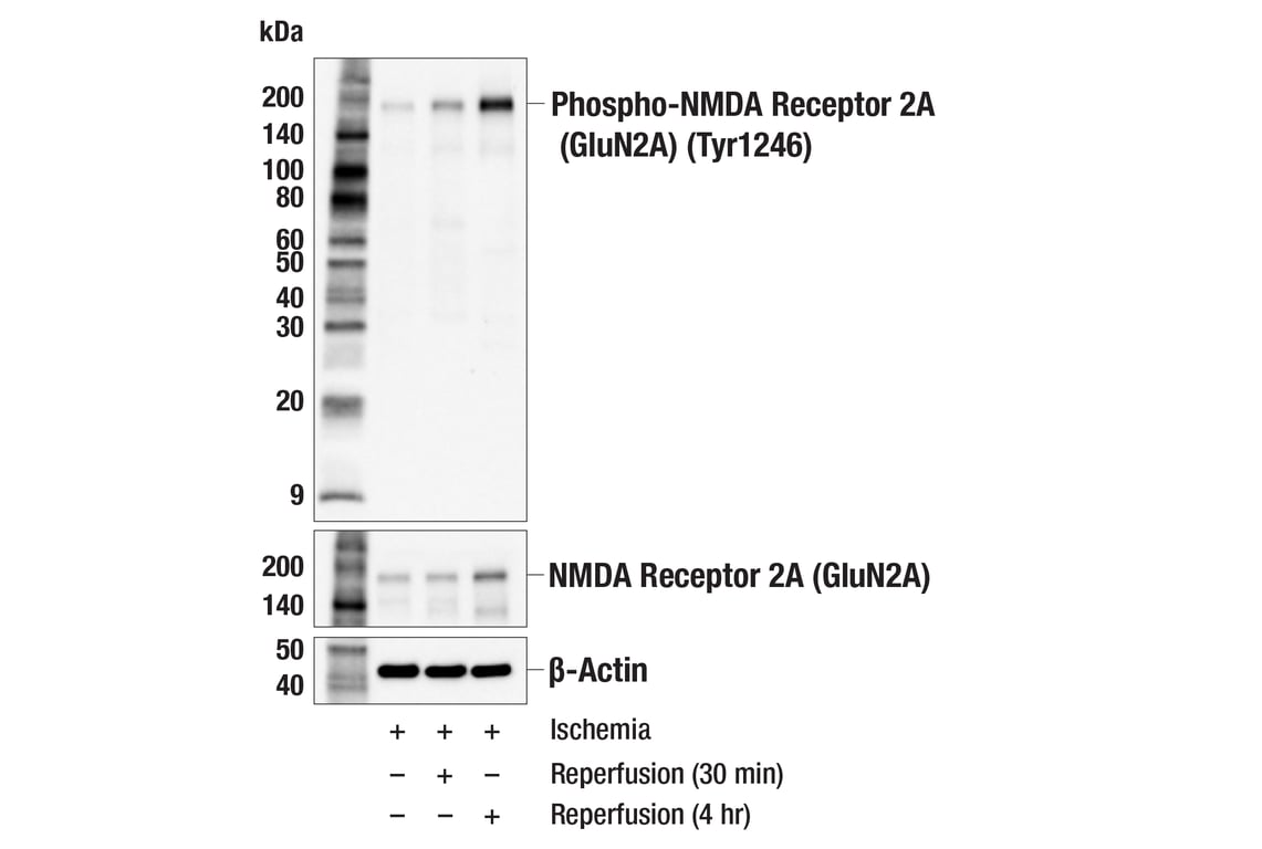 EphrinB2 binding to the receptor EphB leads to the activation of Src family tyrosine kinases, which phosphorylate NMDAR2B at Tyr1252, Tyr1336, and Tyr1472. In turn, phosphorylated NMDAR2B enhances the ability of the functional NMDA receptor to regulate Ca2+ influx in response to glutamate (7). The phosphorylation site of NMDAR2A at Tyr1246 is the conserved site of NMDAR2B at Tyr1252 and was independently identified at Cell Signaling Technology (CST) using PhosphoScan®, a CST MS/MS platform for phosphorylation site discovery. Phosphorylation of NMDAR2A at Tyr1246 was observed in extracts isolated from ischemic rat brain. Please visit PhosphoSitePlus®, a CST modification site knowledgebase, at phosphosite.org for additional information.