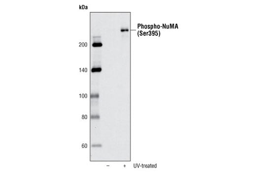 Phospho-NuMA (Ser395) Antibody is directed at a site that was identified at Cell Signaling Technology (CST) using PhosphoScan®, CST's LC-MS/MS platform for modification site discovery. Phosphorylation at Ser395 was discovered using an ATM/ATR substrate antibody and was shown to be induced by UV treatment. Please visit PhosphoSitePlus®, CST's modification site knowledgebase, at www.phosphosite.org for more information.