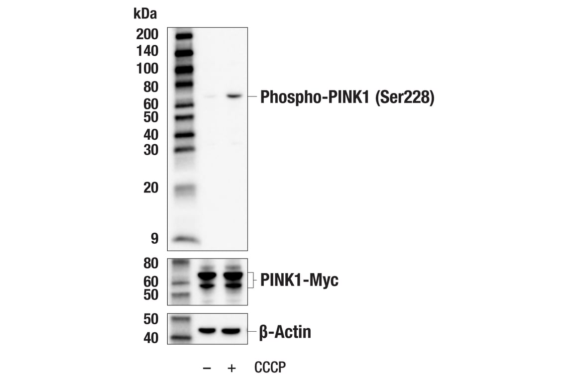 Phospho-PINK1 (Ser228) (E9K3K) Rabbit Monoclonal Antibody recognizes transfected levels of PINK1 protein only when phosphorylated at Ser228. Non-specific bands of unknown origin are observed migrating at ~32 kDa, and at ~80 kDa in mouse cell lines. Human species reactivity is weak by western blot.