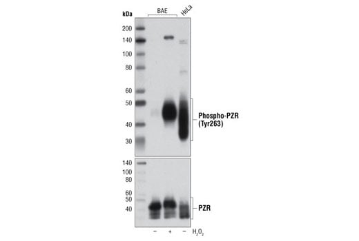 Upon Con A treatment or H2O2 treatment, two PZR intracellular ITIM tyrosine sites-Tyr241 and Tyr263 are phosphorylated (4,8). Phosphorylation of these two sites facilitates recruitment of SHP-2 to PZR which alters the phosphatase activity of SHP-2 and affects its downstream signaling (5,8,9).