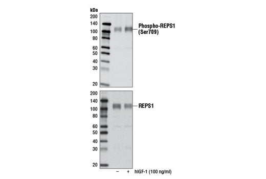 Phosphorylation of Ser709 on REPS1 was identified at Cell Signaling Technology using PTMScan® Technology, our LC-MS/MS platform for phosphorylation site discovery (4).