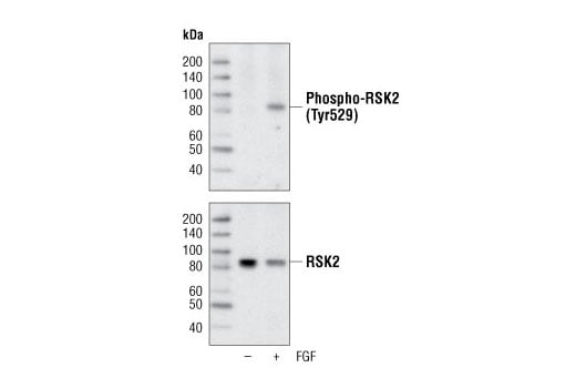 Phosphorylation of RSK2 on Tyr529 was identified at Cell Signaling Technology (CST) using PhosphoScan®, our LC-MS/MS platform for phosphorylation site discovery. This study identifies RSK2 as a key substrate of FGFR3 in human t(4;14)-positive multiple myeloma (MM) cells. Constitutively active FGFR3 directly phosphorylates RSK2 on Tyr529, which primes RSK2 for activation by ERK1/2 (4). Mutations in the RSK2 gene are associated with Coffin-Lowry syndrome (CLS), an X-linked disorder characterized by mental retardation and the presence of characteristic facial anomalies (5).