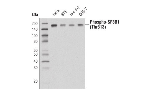 Phosphorylation of SF3B1 at Thr313 is only found in catalytically active spliceosomes and associates mainly with chromatin, where about 80% of pre-mRNA splicing occurs. Treatment with a transcription inhibitor 5,6-dichloro-1-β-d-ribofuranosylbenzimidazole (DRB) leads to a decreased supply of pre-mRNA, resulting in the loss of phospho-SF3B1 (Thr313), consistent with its association with active splicing (7).