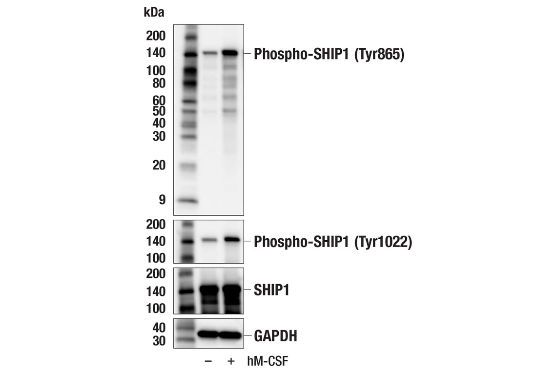Phospho-SHIP1 (Tyr865) (F3N9M) Rabbit Monoclonal Antibody recognizes endogenous levels of SHIP1 protein only when phosphorylated at Tyr865 of human SHIP1, Tyr868 of mouse SHIP1, or Tyr867 of rat SHIP1.