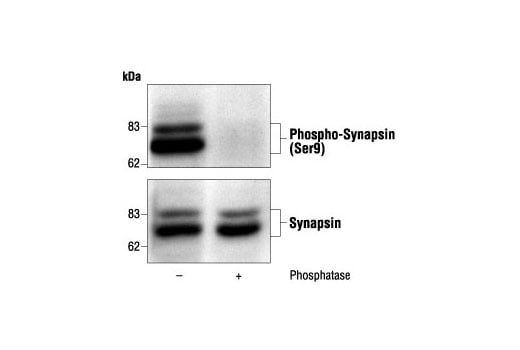 Phospho-Synapsin (Ser9) Antibody detects endogenous levels of synapsin only when phosphorylated at serine 9. This antibody is expected to recognize phosphorylated serine 9 of all synapsin isoforms.