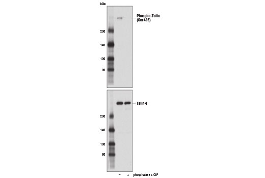 Phospho-Talin (Ser425) (D2P2M) Rabbit Monoclonal Antibody recognizes endogenous levels of talin protein only when phosphorylated at Ser425. Based on sequence homology, this antibody is expected to recognize both talin-1 and talin-2 proteins phosphorylated at Ser425.