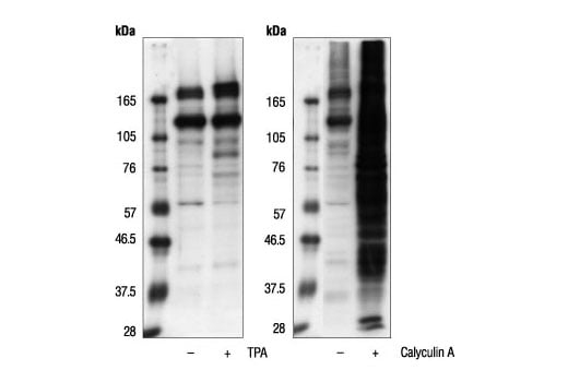 Some signaling molecules can be regulated by phosphorylation at a specific threonine followed by arginine or lysine at the +2 position. For example, conventional PKC isozymes phosphorylate substrates containing serine or threonine with Arg or Lys at the -3, -2 and +2 positions (1-2). c-Raf, a mitogen-activated protein kinase and the main effector recruited by GTP-bound Ras, is phosphorylated at Thr481 and Thr491 followed by Lys at the +2 position (3). Phosphorylation of these sites is important for enzyme activities. To determine the phosphorylation state of Thr in the Thr-X-Arg motif, and to identify potential new phosphorylation sites with this motif, Cell Signaling Technology has developed a Phospho-Threonine X-Arginine Antibody that recognizes phosphorylated Thr followed by Arg or Lys at the +2 position.