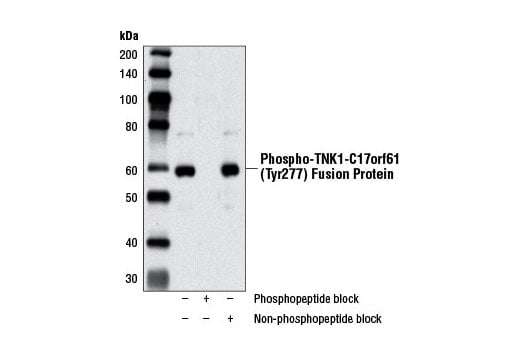 Phosphorylation of TNK1 on Tyr277 was identified at Cell Signaling Technology (CST) using PhosphoScan®, CST's LC-MS/MS platform for phosphorylation site discovery (4) and also reported independently in another publication using MS technology (5). Phosphorylation of TNK1 at Tyr277 was observed in select carcinoma cell lines and in tumors. A constitutively active, 58 kDa truncated TNK1 kinase resulting from fusion between the TNK1 and C17orf61 genes is seen in some cells (5). For additional information, visit PhosphoSitePlus™, CST's modification site knowledgebase, at www.phosphosite.org.