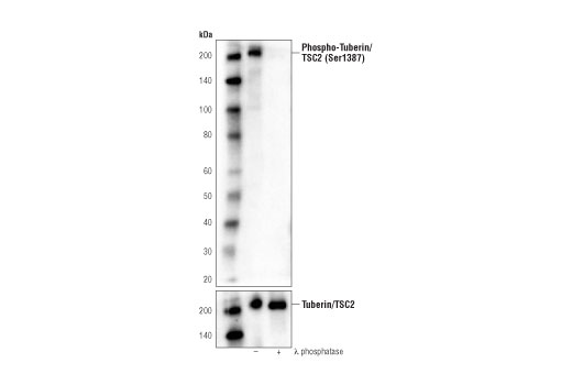 Phospho-Tuberin/TSC2 (Ser1387) (D2R3A) Rabbit Monoclonal Antibody detects endogenous levels of tuberin protein only when phosphorylated at Ser1387. This antibody may also cross-reacts with an unidentified 140 kD protein.