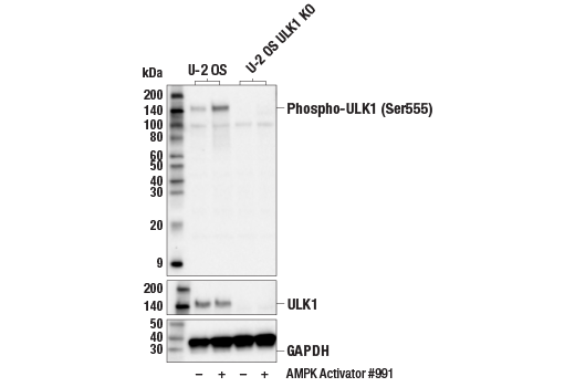 Phospho-ULK1 (Ser555) (D1H4) Rabbit Monoclonal Antibody (BSA and Azide Free) detects endogenous levels of ULK1 only when phosphorylated at Ser555 of mouse ULK1 (equivalent to Ser556 of human ULK1). Bands of unknown origin are detected between 90 and 100 kDa.