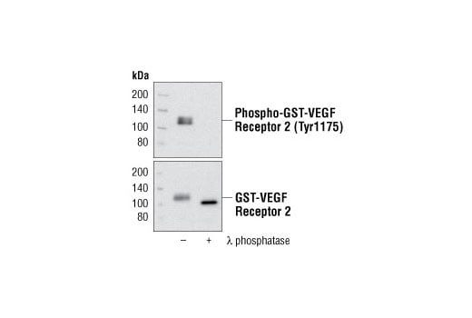 Phospho-VEGF Receptor 2 (Tyr1212) (11A3) Rabbit Monoclonal Antibody detects transfected levels of VEGFR-2 only when phosphorylated at tyrosine 1212. This antibody does not cross-react with other phosphorylated receptor tyrosine kinases.