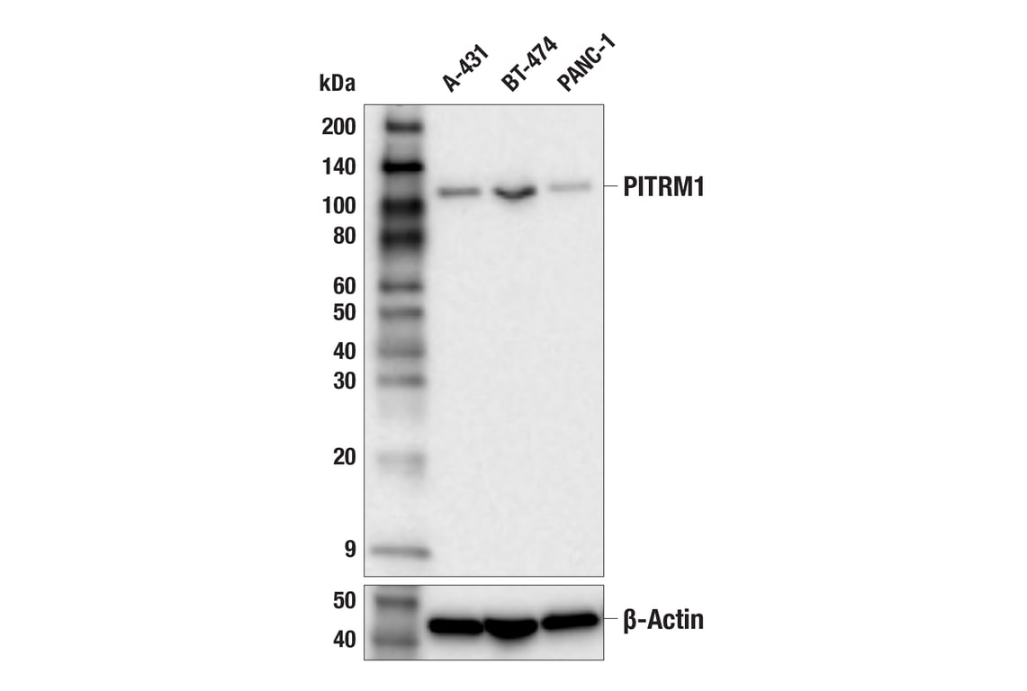 PITRM1 (F2Y2T) Rabbit Monoclonal Antibody recognizes endogenous levels of total PITRM1 protein.