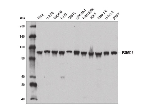 Regulatory particle non-ATPase 1 (RPN1, PSMD2) is a subunit of the 19S/PA700 regulatory particle base subcomplex. The PSMD2 protein acts as part of the scaffold for assembly of the 19S/PA700 RP base subcomplex (3). Research studies demonstrate that PSMD2 binds the intracellular domain of type I TNF receptor, indicating that the 26S proteasome may play a role in the TNF signaling pathway (4,5). PSMD2 expression correlates with poor prognosis in lung cancer patients, and induced inhibition of PSMD2 results in decreased proteasome activity and increased apoptosis in lung cancer cells (6).