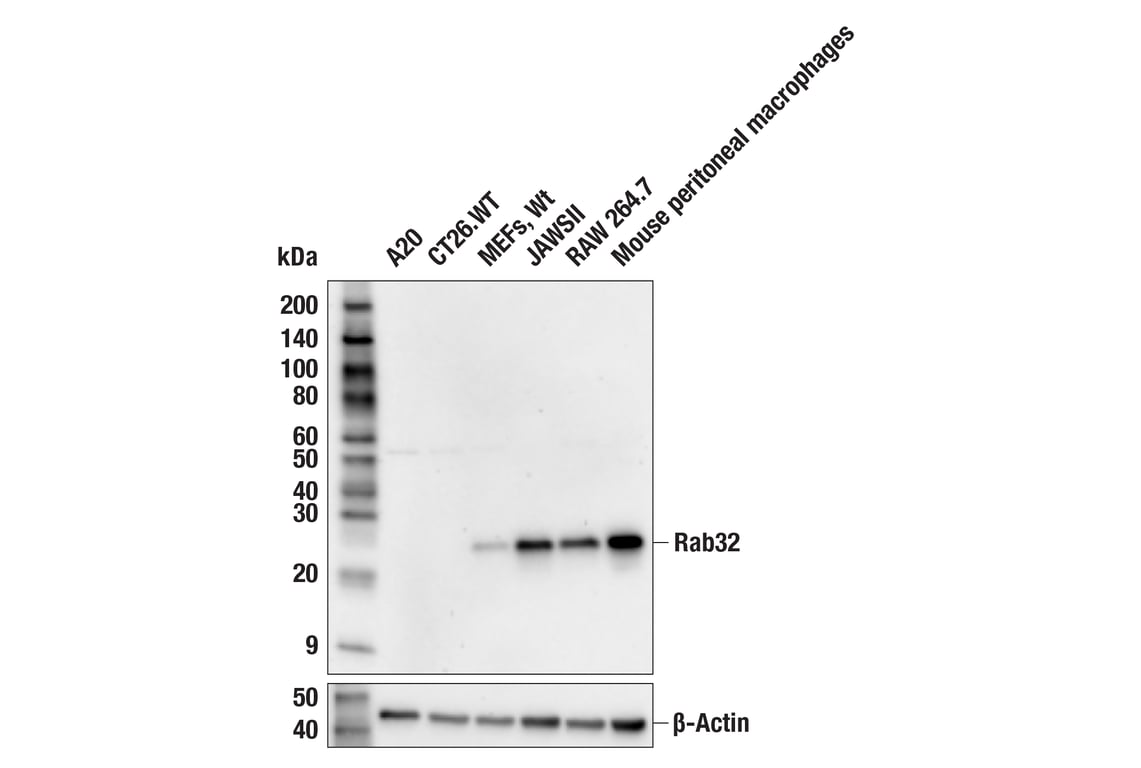 Rab32 (F6E5T) Rabbit Monoclonal Antibody recognizes endogenous levels of total Rab32 protein. This antibody detects a 55 kDa protein of unknown identity in some cell lines.