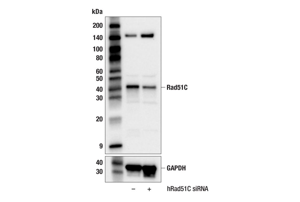 Rad51C (F6D1F) Rabbit Monoclonal Antibody recognizes endogenous levels of total Rad51C protein. This antibody detects approximately 145 and greater than 200 kDa proteins of unknown identity in some cell lines.