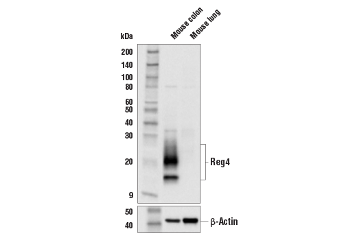Reg4 (E7Z7S) Rabbit Monoclonal Antibody recognizes endogenous levels of total Reg4 protein. In some mouse tissues, such as liver, non-specific bands of different molecular weights, but of unknown identity may be observed.