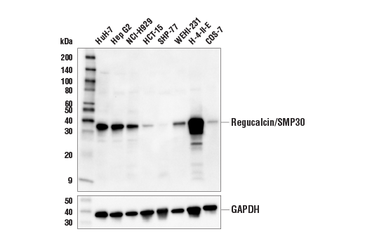 Regucalcin/SMP30 (E3L6L) Rabbit Monoclonal Antibody recognizes endogenous levels of total regucalcin/SMP30 protein.