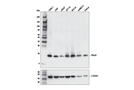 RhoG (E9B7Z) Rabbit Monoclonal Antibody recognizes endogenous levels of total RhoG protein. This antibody does not cross-react with Rac1 or Cdc42 proteins.