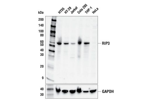 RIP3 (E1V1D) Rabbit Monoclonal Antibody recognizes endogenous levels of total RIP3 protein.