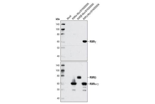RXRγ expression, unlike that of RXRα and RXRβ, is restricted largely to cardiac muscle, skeletal muscle, thyroid gland, and thyrotrope cells of the anterior pititary gland (3-6). It is posited that RXRγ plays a pivitol role in the transcriptional control of skeletal muscle differentiation as RXRγ has been found to be directly associated with the promoter regions of MyoD and myogenin (7-10). RXRγ is also involved in the transcriptional control of the hypothalamic-pituitary-thyroid axis through repression of the TSHβ promoter (11-13).