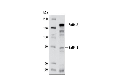 Sall4 (D16H12) Rabbit Monoclonal Antibody recognizes endogenous levels of total Sall4A and Sall4B proteins. Western blot analysis detects additional bands that are likely Sall4 isoforms.