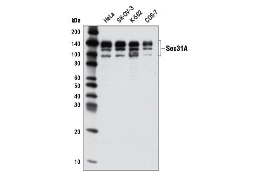 Sec31A Antibody recognizes endogenous levels of multiple isoforms of total Sec31A protein, ranging in sizes of 95-140 kDa.
