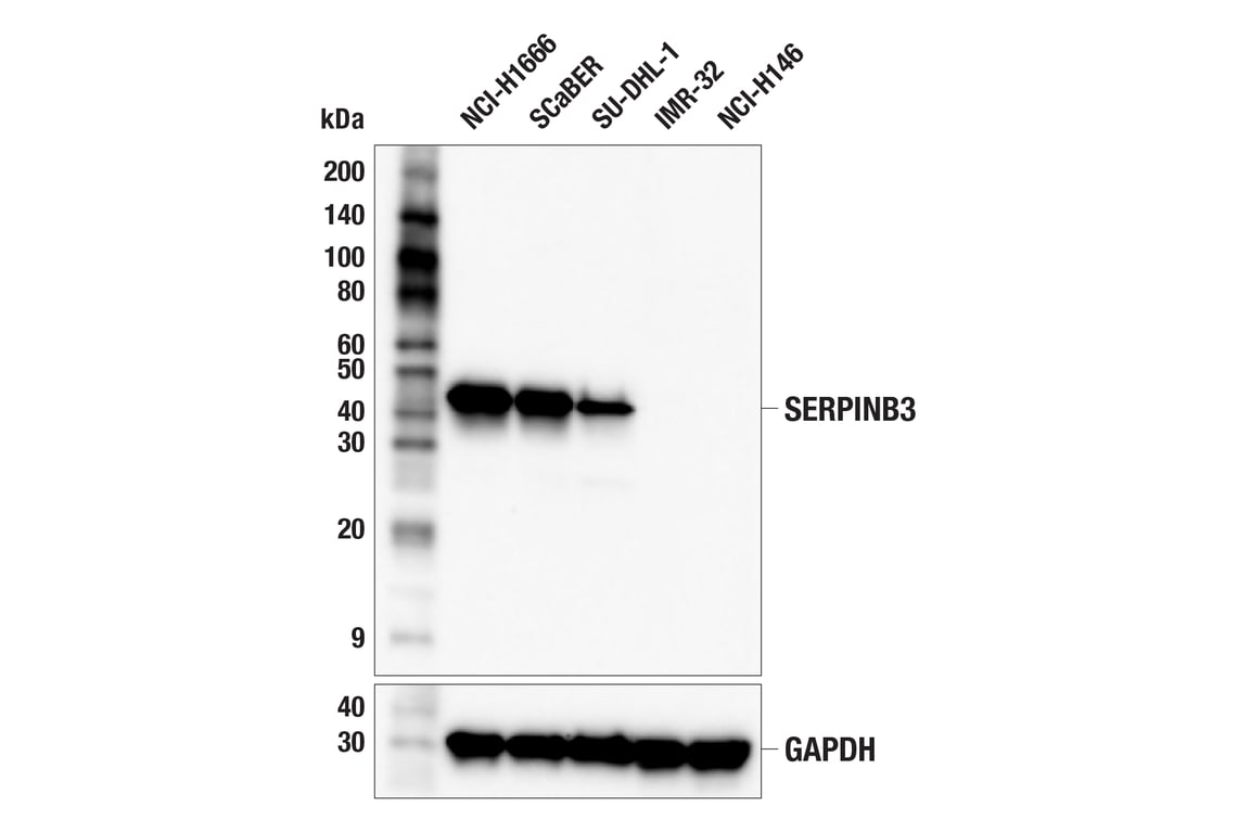 SERPINB3 (F3Z8E) Rabbit Monoclonal Antibody recognizes endogenous levels of total SERPINB3 protein. This antibody detects a 25 kDa protein of unknown identity in some cell lines.
