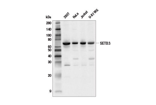 SETD3 Antibody recognizes endogenous levels of total SETD3 protein. This antibody may detect a band of unknown identity at 28 kDa.