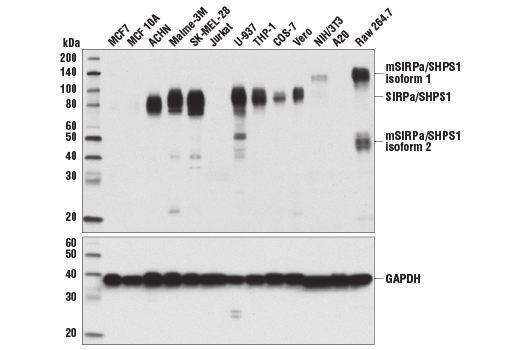 SIRP alpha/SHPS1 (D6I3M) Rabbit Monoclonal Antibody (BSA and Azide Free) recognizes endogenous levels of total SHPS1 protein. This antibody recognizes both large and small isoforms of murine mSHPS1/SIRPα.