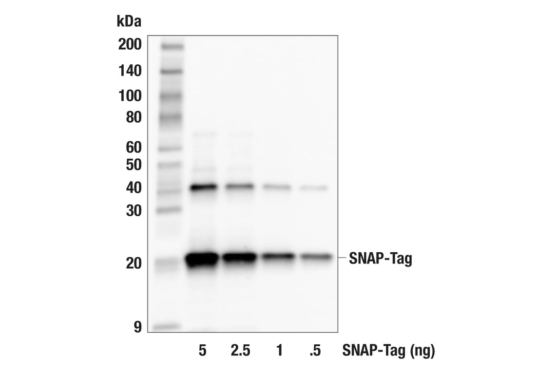 SNAP-tag is a 20 kDa mutant of the DNA repair protein O6-alkylguanine-DNA alkyltransferase (AGT) that, when “tagged” to the protein-of-interest, can be used to measure the tagged protein’s expression, localization, and interactions with other proteins. AGT reacts specifically and rapidly with ectopically applied benzylguanin derivative substrates, resulting in covalent labeling of SNAP-tag (1). The benzylguanin derivatives, when labeled with fluorophores, for example, can be used as irreversible probes for SNAP-tagged fusion proteins. SNAP-tag can also be independently detected and labeled using a SNAP-tag protein-specific antibody using a variety of immuno-based assays.