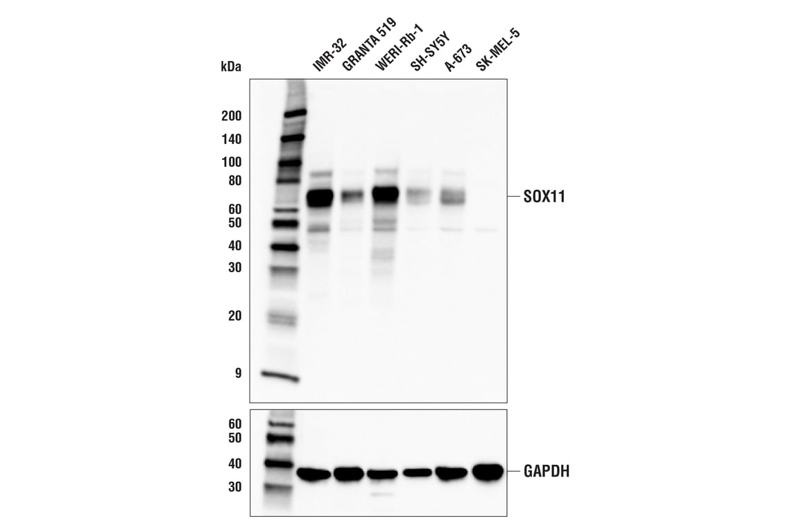 SOX11 (E7G9N) Rabbit Monoclonal Antibody recognizes endogenous levels of total SOX11 protein. In some cell extracts, the antibody weakly detects a 48 kDa protein. The identity of this protein is unknown.