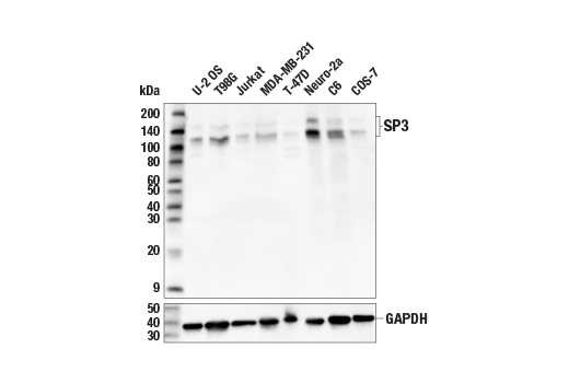 SP3 (E6Q9Q) Rabbit Monoclonal Antibody recognizes endogenous levels of total SP3 protein. The antibody shows weak cross-reactivity with an 85 kDa protein of unknown identity in some cell extracts.