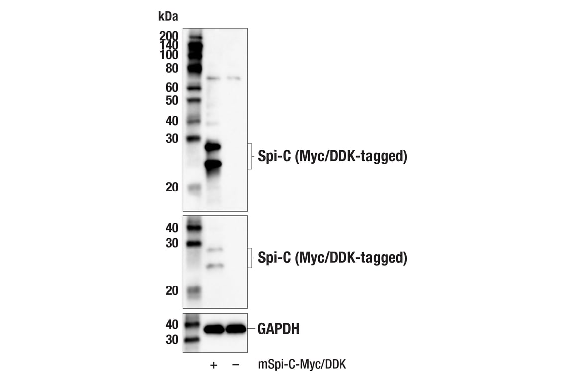 Spi-C (E7V7F) Rabbit Monoclonal Antibody recognizes overexpressed levels of total Spi-C protein. This antibody detects a 70 kDa band of unknown origin in some cell lines.