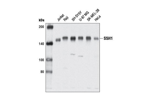 SSH1 (E1K3W) Rabbit Monoclonal Antibody recognizes endogenous levels of total SSH1 protein. Based on the absence of sequence homology, this antibody is not expected to recognize SSH2 or SSH3.