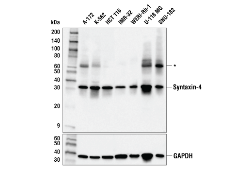 Syntaxin-4 (E6W7B) Rabbit Monoclonal Antibody (BSA and Azide Free) recognizes endogenous levels of total Syntaxin-4 protein. This antibody may also detect a putative SDS-resistant Syntaxin-4 protein-containing (SNARE) complex at approximately 65 kDa.