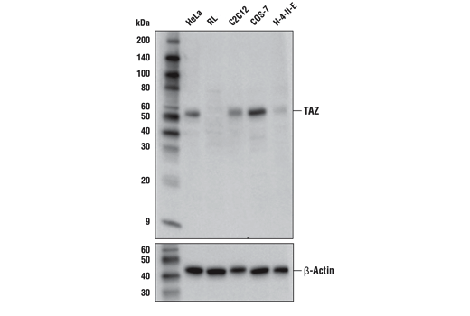 TAZ (E5P2N) Mouse Monoclonal Antibody recognizes endogenous levels of total TAZ protein.