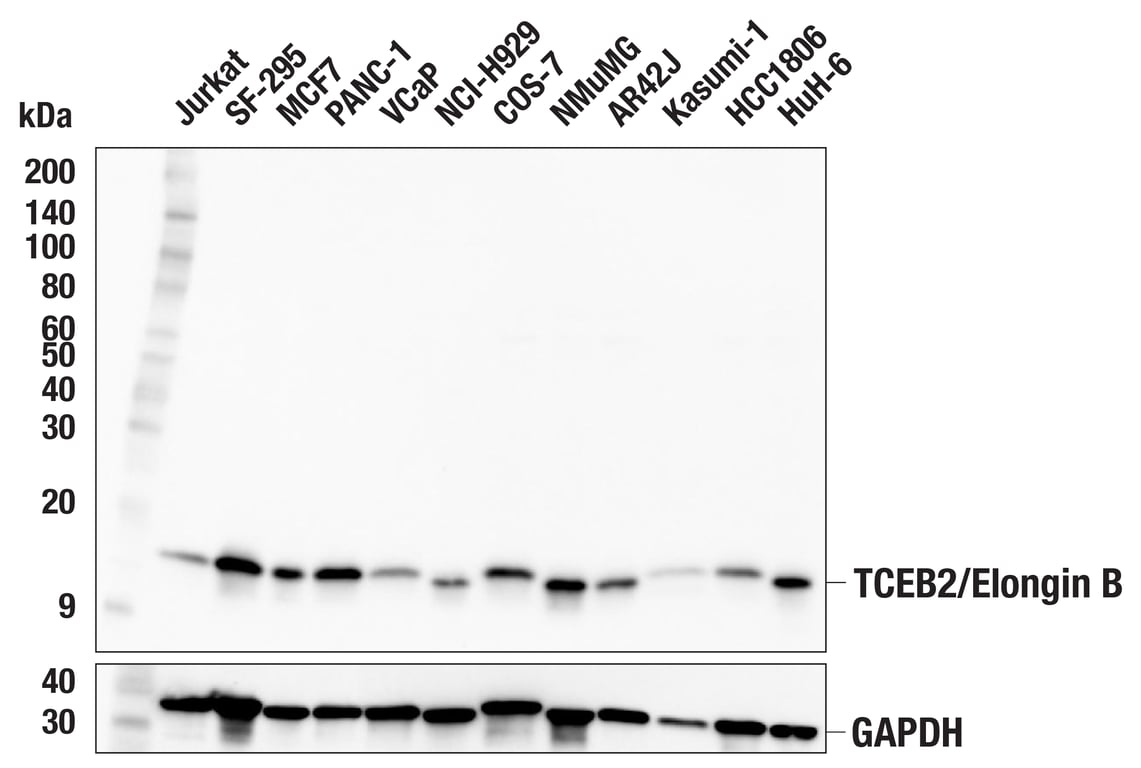 TCEB2/Elongin B (F3G5G) Rabbit Monoclonal Antibody recognizes endogenous levels of total TCEB2/Elongin B protein. Based on sequence homology, this antibody is not predicted to cross-react with TCEB1/Elongin C protein.