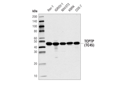 TCPTP (TC45) (D7T7D) Rabbit Monoclonal Antibody (BSA and Azide Free) recognizes endogenous levels of total TCPTP (TC45) protein. This antibody does not recognize the 48 kDa (TC48) isoform.
