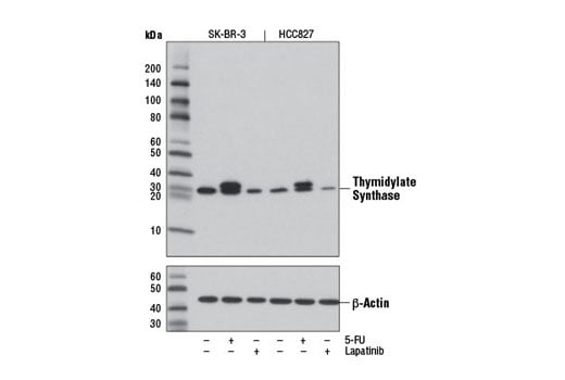 Levels of thymidylate synthase can be modultated in vitro by treatment with various drugs, such as 5-FU and lapatinib. 5-FU treatment induces the formation of two distinct bands, one at 35 kDa and another at 38 kDa, while lapatinib treatment results in a decrease in thymidylate synthase expression (11,12).