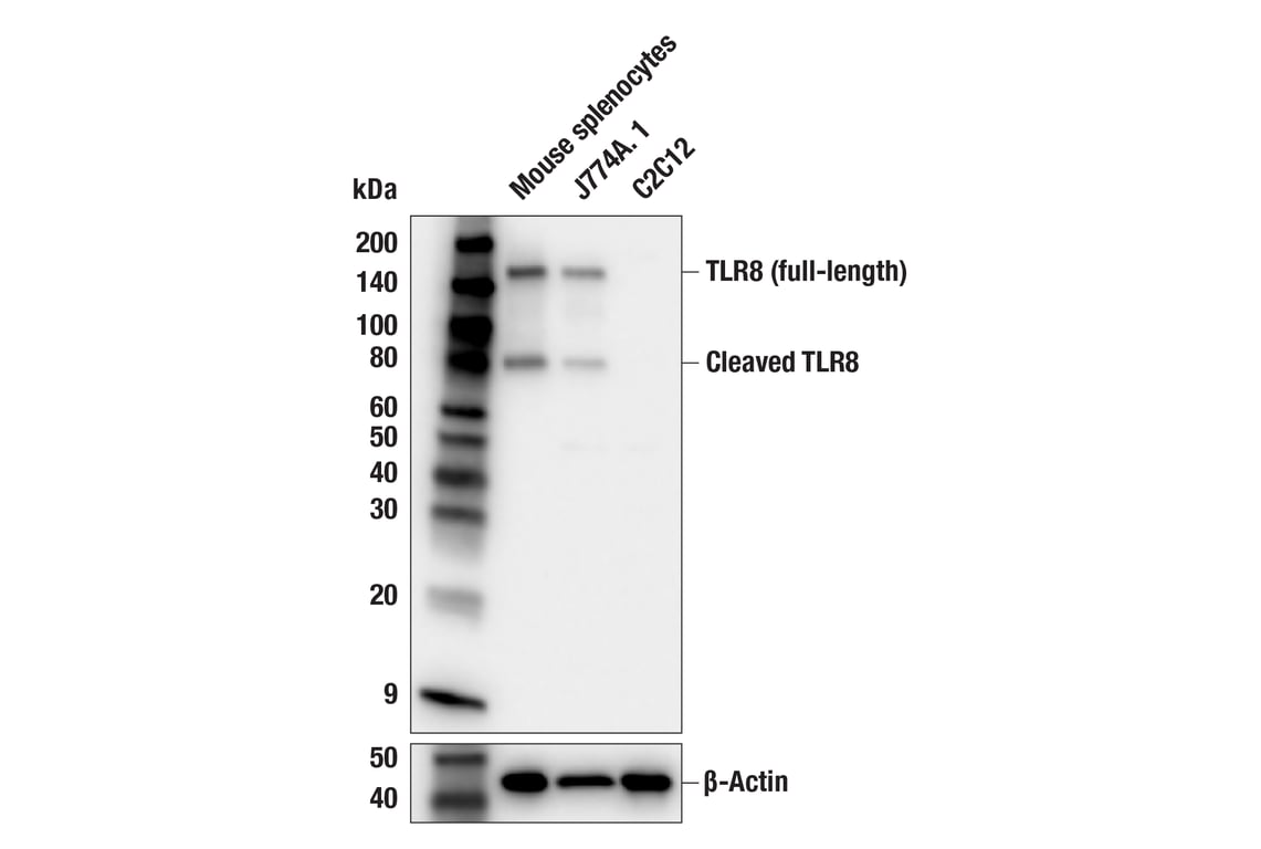 TLR8 (F2A6I) Rabbit Monoclonal Antibody recognizes endogenous levels of total TLR8 protein and the 80 kDa proteolytically cleaved form of TLR8.
