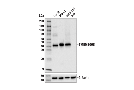TMEM106B (E7H7Z) Rabbit Monoclonal Antibody recognizes endogenous levels of total TMEM106B protein. 93334 shows questionable staining in few tissues, including staining of a subset of cells among normal colon epithelium, squamous epithelium staining of one salivary tumor, and staining of cytoplasmic spots in one lymphoma.