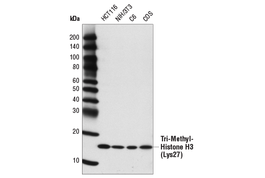 Tri-Methyl-Histone H3 (Lys27) (C36B11) Rabbit Monoclonal Antibody (BSA and Azide Free) detects endogenous levels of histone H3 only when tri-methylated on Lys27. This antibody does not cross-react with non-methylated, mono-methylated or di-methylated Lys27. In addition, this antibody does not cross-react with mono-methylated, di-methylated or tri-methylated histone H3 at Lys4, Lys9, Lys36 or Histone H4 at Lys20.