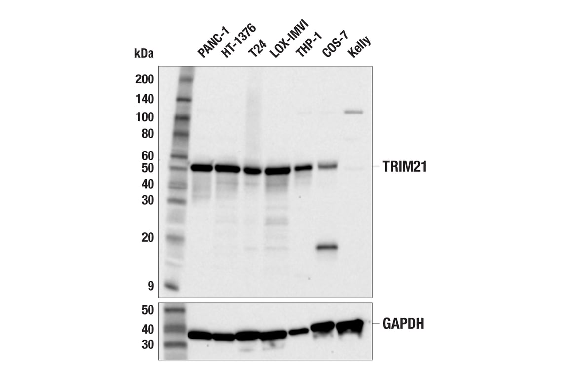TRIM21 (F6K7J) Rabbit Monoclonal Antibody recognizes endogenous levels of total TRIM21 protein.