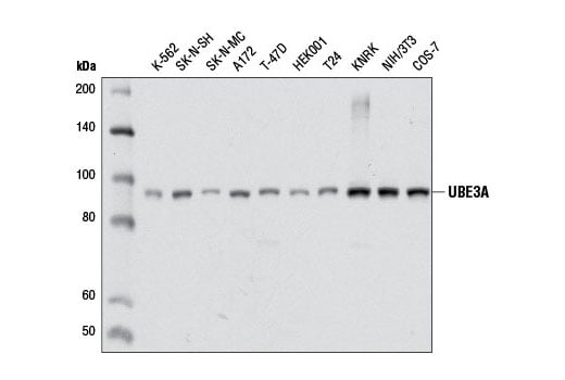 UBE3A (D10D3) Rabbit Monoclonal Antibody recognizes endogenous levels of total UBE3A protein. Based upon sequence alignment, this antibody is predicted to cross-react with all UBE3A splice variants.